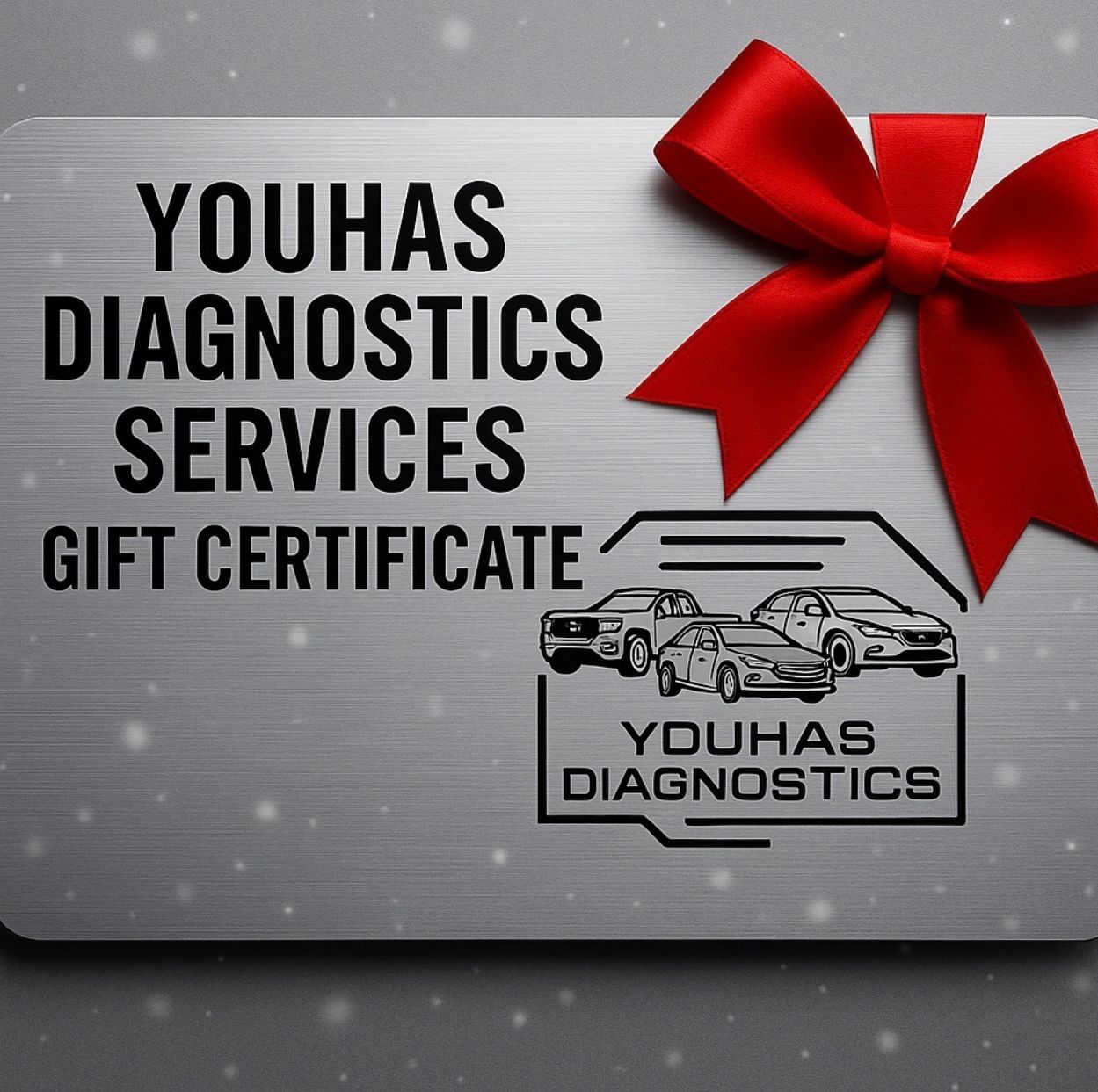 Choose the amount and let them choose the service. Your Youhas Diagnostics E-Gift Card works for any repair, maintenance, diagnostic service, or remote start installation. Delivered instantly by email and easy to redeem. A flexible, practical gift for any vehicle.